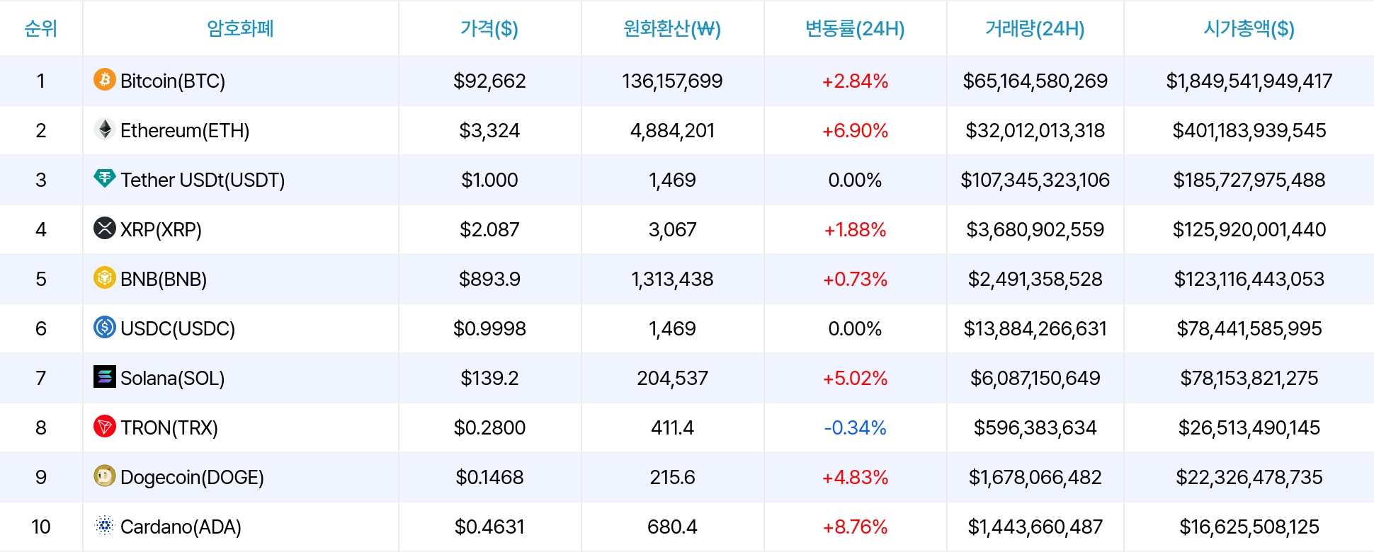 암호화폐 시장 혼조세… 비트코인 9만2704달러, 이더리움 3326달러